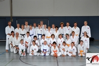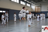 [15.09.2015] Am 13. September 2015 war KDNW-Kata-Landestrainer Tim Milner (4. Dan) zu Gast in unserem Dojo, seines Zeichens mehrfacher Deutscher Meister sowohl in Kata als auch in Kumite und damit definitiv ein Ausnahme-Karateka. Außerdem ist Tim ein sehr erfahrener Trainer und begeisterte die Teilnehmer/innen jeden Alters gleichermaßen mit seiner geraden aber charmanten Art. Seine Furchtlosigkeit stellte er im Spezialtraining für Karate-Kids unter zehn Jahre unter Beweis, mit ihnen absolvierte er ein buntes Training mit vielfältigen Aufgaben aus den Bereichen Koordination, Schnelligkeit, Heian-Kata und Bunkai-Elementen. In der besonders gut besuchten Gruppe der Weiß- bis Blaugurte (ab 10 Jahre) wurde die Kata Heian Godan thematisiert und in der Oberstufe die Kata Kanku Sho. Beide Kata haben einen bzw. mehrere Sprünge, für die Tim uns Kniffe und Tipps verriet. Außerdem wurde die Stabilisation von Rumpf und Unterbau trainiert sowie die Bunkai der Kata. "Das war wirklich toll, der darf gerne noch mal wiederkommen", so das einhellige Fazit unserer Karateka sowie der Gäste. Also alles in allem ein sehr gelungener Lehrgang, der durch die ebenfalls erfolgreichen Gürtelprüfungen abgerundet wurde. An dieser Stelle soll es nicht versäumt werden, den Mitgliedern zu danken, die mich als Dojoleiterin an diesem langen Tag so hervorragend unterstützt haben! Ein Verein ist nur vereint stark und das habt ihr an diesem Tag eindrucksvoll gezeigt. Besonderer Dank geht an Sabine, die sich engelsgleich um Einkauf und Büffet bemüht hat, an Melina, die ebenfalls von früh bis spät geholfen hat, an Max, meinen Beisitzer, außerdem an Ralf, an Simon, an Leonard, an die verschnupfte Francesca, die trotzdem da war, an Volker, an Judith, an den neuen Nils, an die Eltern für die tollen Kuchenspenden und überhaupt an alle, die mitgeholfen haben und die mitgemacht haben! Unser nächster Lehrgang ist zusammen mit Gürtelprüfungen und Weihnachtsfeier für den 19.12.2015 geplant! Infos folgen demnächst.