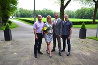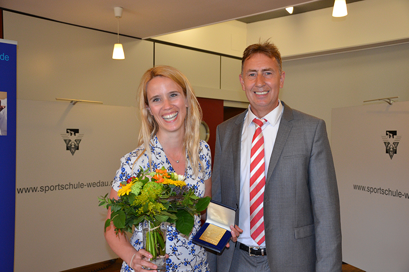 KDNW-Präsident Rainer Katteluhn nahm die Ehrung vor und stellte in seiner Laudatio vor allem Eva Monas kürzlich bestandene Weltkampfrichterprüfung heraus.