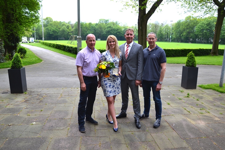 | Die NRW-Kampfrichter-Doppelspitze Uwe Portugall (r.) und Ralf Vogt (l.) hatte sich für die Ehrung von Eva Mona eingesetzt. |