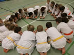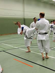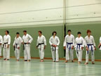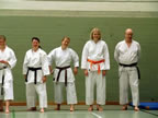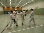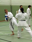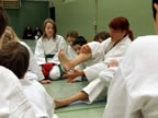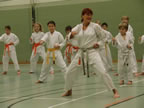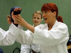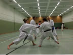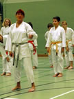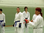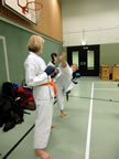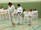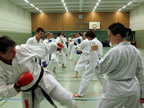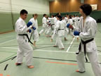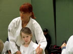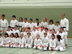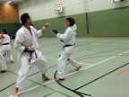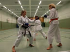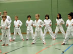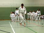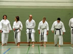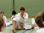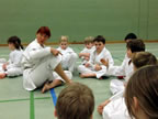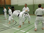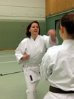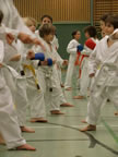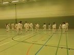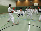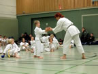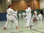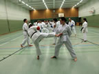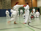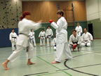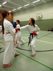 [05.01.2011] Am 18.12.2010 war Susanne Nitschmann, 5. Dan (Landestrainerin Kumite, Frauenreferentin KDNW) zu Gast in unserem Dojo. Der kleine Kumite-Lehrgang ganz kurz vor Weihnachten umfasste zwei Trainingseinheiten: Eine für Erwachsene und Jugendliche ab 14 Jahre und eine für Kinder unter 14 Jahre. Susanne Nitschmann verstand es wie immer auch Karateka mit zarterem Naturell Spaß am Partnertraining zu vermitteln. Bei der Gruppe ab 14 Jahre war das Thema "Distanz": Trainiert wurden Fußtritte, sowie der Gyaku-Zuki in "normaler" und "überlaufener" Form. Bei den Kleinen bewies Susanne, das sie so ziemlich jeden Flohhaufen bändigen kann. Mit viel Herzlichkeit, aber auch der nötigen Strenge bot sie den Karate-Kids ein abwechslungsreiches Training mit viel Spaß. Herzlichen Dank für den tollen Lehrgang! Und natürlich an alle Teilnehmer/innen fürs Mitmachen!