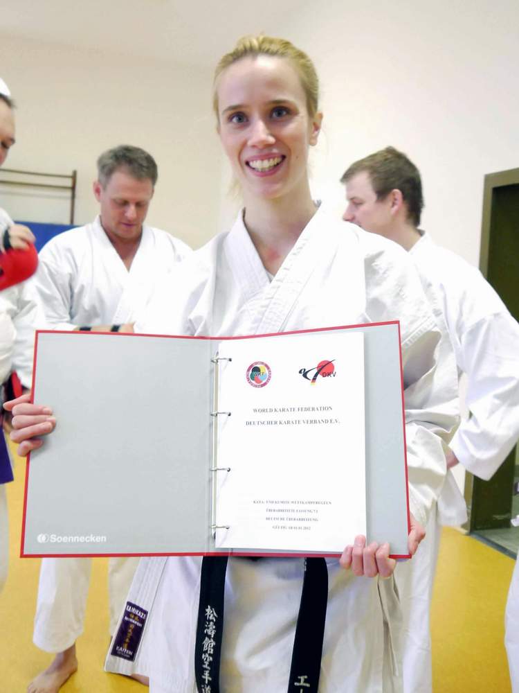 [03.01.2012] Am 01.01.2012 sind die neuen Wettkampfregeln des Deutschen Karate Verbandes e.V. (DKV) in Kraft getreten. Im Jahr 2011 hat die World Karate Federation (WKF) umfassende Änderungen an den bisherigen Wettkampfregeln erarbeitet und schließlich ein neues Regelwerk verabschiedet und veröffentlicht. Der Deutsche Karate Verband e.V. hat unsere Dojoleiterin Eva Mona Altmann mit der Übersetzung des Textes aus dem Englischen und der deutschen Überarbeitung beauftragt. Sie nahm sich dieser ehrenvolle Aufgabe gerne an und freute sich, sowohl ihre Erfahrung als Kampfrichterin als auch gleichermaßen ihr Know-How als diplomierte Übersetzerin hier einbringen zu können. Im Rahmen unseres Jahresabschlusslehrganges nahm sie stolz vom stellvertetenden NRW-Kampfrichterreferenten Ralf Vogt die erste offizielle Druckfassung des neuen DKV-Regelwerkes entgegen. Das neue Regelwerk ist online auf der Homepage des DKV abrufbar. Die offizielle Zusammenfassung der ab 2012 gültigen Änderungen ist auch auf der Seite des Karate Dachverbandes NRW e.V. (KDNW) verfügbar. Eva Monas Dank gilt dem DKV und Bundeskampfrichterreferent Roland Lowinger für das ihr entgegen gebrachte Vertrauen sowie Javier Escalante (WKF-Secretary), der sich die Zeit nahm, einzelne Rückfragen zum Text persönlich zu beantworten und insbesondere Uwe Portugall (Landeskampfrichterreferent NRW, WKF-Referee), der mit seinem fachkundigen und detailgenauen Feedback mit zum Gelingen der Übersetzung beigetragen hat. Foto: Lex © 1. Karate Ag Kölner Schulen e.V. |