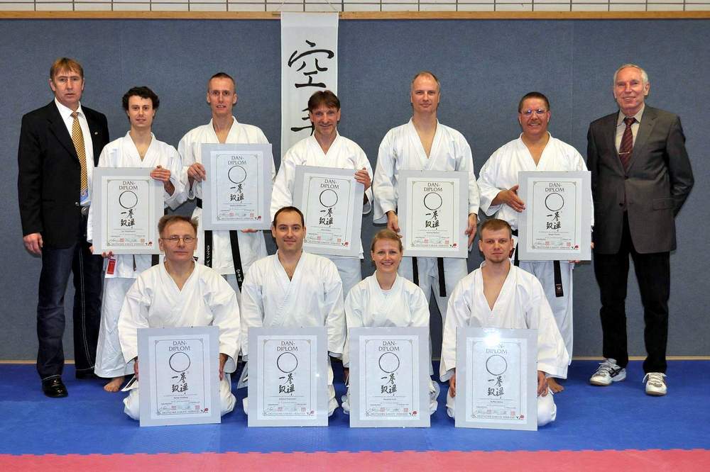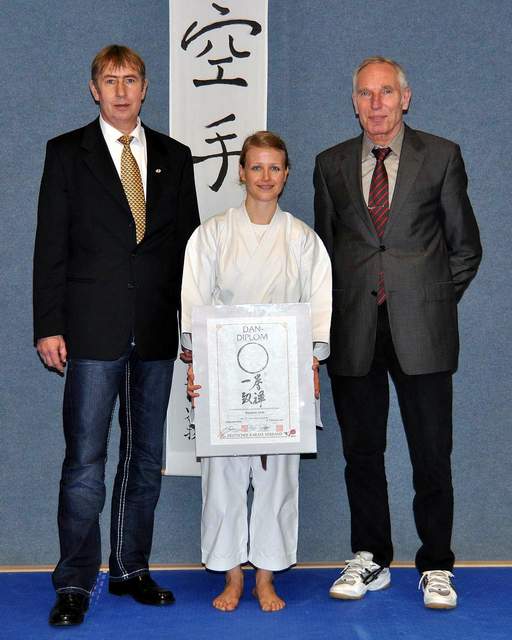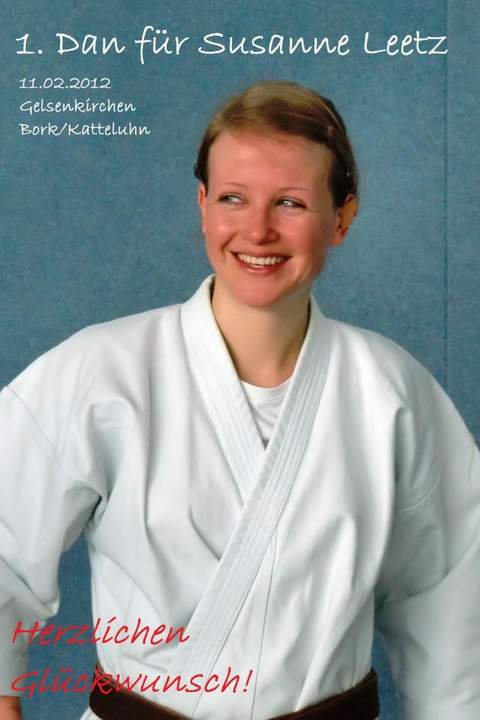Am 11.02.2012 hat unser Mitglied Susanne Leetz die Prüfung zum 1. Dan (erster schwarzer Gürtel) erfolgreich bestanden. Herzlichen Glückwunsch! Die Prüfung wurde in Gelsenkirchen von Franz Bork (8. Dan) und Rainer Katteluhn (6. Dan) abgenommen. Mit nur zehn Kandidaten (davon fünf zum 1. Dan) war das Teilnehmerfeld recht überschaubar, so dass sich die Prüfer viel Zeit für für jeden einzelnen nehmen konnten. Unterstützung vor Ort erfuhr Susanne von Trainerin und Dojoleiterin Eva Mona Altmann, von den befreundeten Karateka aus Bonn, St. Augustin und der Shotokan-Schmiede sowie von ihrem Lebensgefährten Thomas, selbst Karateka. Susanne hat sich lange, intensiv und gewissenhaft auf ihre Prüfung vorbereitet. Neben dem regelmäßigen Training in unserem Dojo und Trainingseinheiten in anderen Dojos hat sie in den letzten Wochen auch am Training der Shotokan-Schmiede in Dierdorf teilgenommen und erhielt hier von Franz Bork persönlich noch den letzten Feinschliff für die Prüfung. Die Prüfung zum 1. Dan (Schwarzgurt) ist ein ganz besonderer Tag im Leben eines jeden Karateka. Zwischen Susannes erster Karate-Stunde in unserem Dojo und ihrer Dan-Prüfung liegen rund 16 Jahre kontinuierlichen Trainings. Dabei ließ Susanne sich nie beirren oder von ihrer Karate-Leidenschaft abbringen - weder durch Knieprobleme, noch durch das Medizinstudium, Auslandsaufenthalte oder den stressigen Berufsalltag im Kinderkrankenhaus - und blieb auch unserem Dojo stets treu verbunden. In der heutigen schnelllebigen Zeit ist Susanne eine vobildliche Ausnahmeerscheinung in puncto Ausdauer, Beharrlichkeit, Fleiß und Bescheidenheit - Eigenschaften, die auch ihre Trainingspartner und Vereinskameraden sehr an ihr schätzen. Daher freuen wir uns alle sehr über Susannes Erfolg und darüber, nun eine Danträgerin mehr in unseren Reihen zu haben. Wir wünschen Susanne weiterhin alles Gute für ihren Karate-Weg!